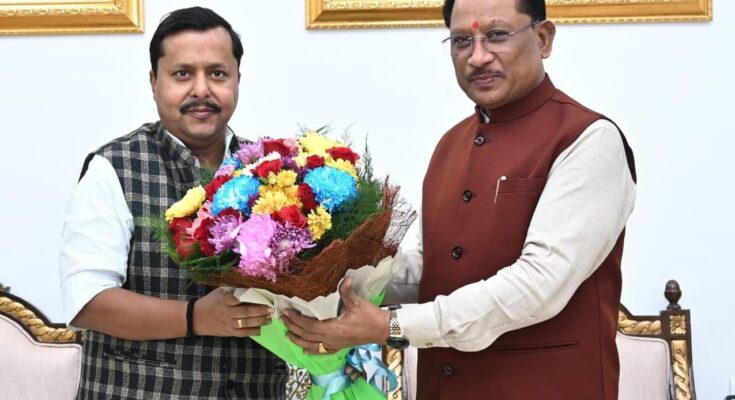 रायपुर 28 नवंबर 2025/ मुख्यमंत्री विष्णु देव साय से आज राजधानी रायपुर स्थित मुख्यमंत्री निवास कार्यालय में बिहार के पथ निर्माण मंत्री नितिन नवीन ने सौजन्य मुलाकात की।