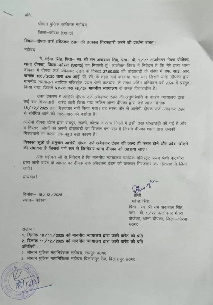 कोरबा। जिले में 27 लाख 90 हजार रुपये की कथित धोखाधड़ी के मामले में आरोपी की गिरफ्तारी न होने पर पुलिस की कार्यप्रणाली पर गंभीर सवाल खड़े हो गए हैं। गेवरा प्रोजेक्ट ऊर्जानगर निवासी महेन्द्र सिंह ने पुलिस अधीक्षक, कोरबा जिला को लिखित आवेदन देकर दीपक उर्फ अंबेडकर टंडन की तत्काल गिरफ्तारी की मांग की है। आवेदन में महेन्द्र सिंह ने बताया कि उन्होंने वर्ष 2020 में थाना दीपका थाना में दीपक उर्फ अंबेडकर टंडन के विरुद्ध 27,90,000 रुपये की धोखाधड़ी को लेकर एफआईआर दर्ज कराई थी। यह मामला एफआईआर क्रमांक 160/2020, धारा 420 आईपीसी के तहत पंजीबद्ध किया गया था। पुलिस जांच के बाद वर्ष 2024 में थाना दीपका द्वारा अंतिम प्रतिवेदन न्यायालय न्यायिक मजिस्ट्रेट प्रथम श्रेणी, कटघोरा के समक्ष प्रस्तुत किया गया, जहां यह प्रकरण क्रमांक 48/24 के रूप में विचाराधीन है। शिकायतकर्ता का आरोप है कि मामले में आरोपी दीपक उर्फ अंबेडकर टंडन लगातार न्यायालय में उपस्थित नहीं हो रहा है। उसकी अनुपस्थिति के चलते न्यायालय द्वारा कई बार गिरफ्तारी वारंट भी जारी किए गए, लेकिन इसके बावजूद आज दिनांक 18 दिसंबर 2025 तक आरोपी की गिरफ्तारी नहीं की गई। महेन्द्र सिंह का कहना है कि यह स्थिति थाना दीपका की लापरवाही या आरोपी से कथित साठ-गांठ की ओर इशारा करती है। आवेदन में यह भी उल्लेख किया गया है कि आरोपी दीपक टंडन द्वारा रायपुर, सक्ती, कोरबा सहित अन्य जिलों में भी इसी तरह की धोखाधड़ी की घटनाएं की गई हैं। शिकायतकर्ता के अनुसार, आरोपी लगातार लोगों को अपने जाल में फंसा रहा है और उसकी गिरफ्तारी न होने से ऐसे मामलों को बढ़ावा मिल रहा है।महेन्द्र सिंह ने यह आशंका भी जताई है कि विश्वसनीय सूत्रों के अनुसार आरोपी जल्द ही फरार होकर प्रदेश छोड़ सकता है। यदि ऐसा होता है तो इसके लिए थाना दीपका की भूमिका को पूरी तरह जिम्मेदार ठहराया जाना चाहिए। उन्होंने मांग की है कि माननीय न्यायालय द्वारा जारी वारंट के आधार पर आरोपी को तत्काल गिरफ्तार कर हिरासत में लिया जाए, ताकि न्यायिक प्रक्रिया प्रभावित न हो और पीड़ित को न्याय मिल सके। मामले को लेकर अब निगाहें पुलिस अधीक्षक कार्यालय की कार्रवाई पर टिकी हैं। यदि शीघ्र गिरफ्तारी नहीं होती है, तो यह मामला पुलिस प्रशासन की कार्यशैली पर बड़ा प्रश्नचिह्न खड़ा कर सकता है। वहीं, स्थानीय लोगों में भी यह चर्चा तेज है कि इतने गंभीर मामले में वर्षों बाद भी आरोपी खुलेआम घूम रहा है, जो कानून व्यवस्था के लिए चिंता का विषय है।