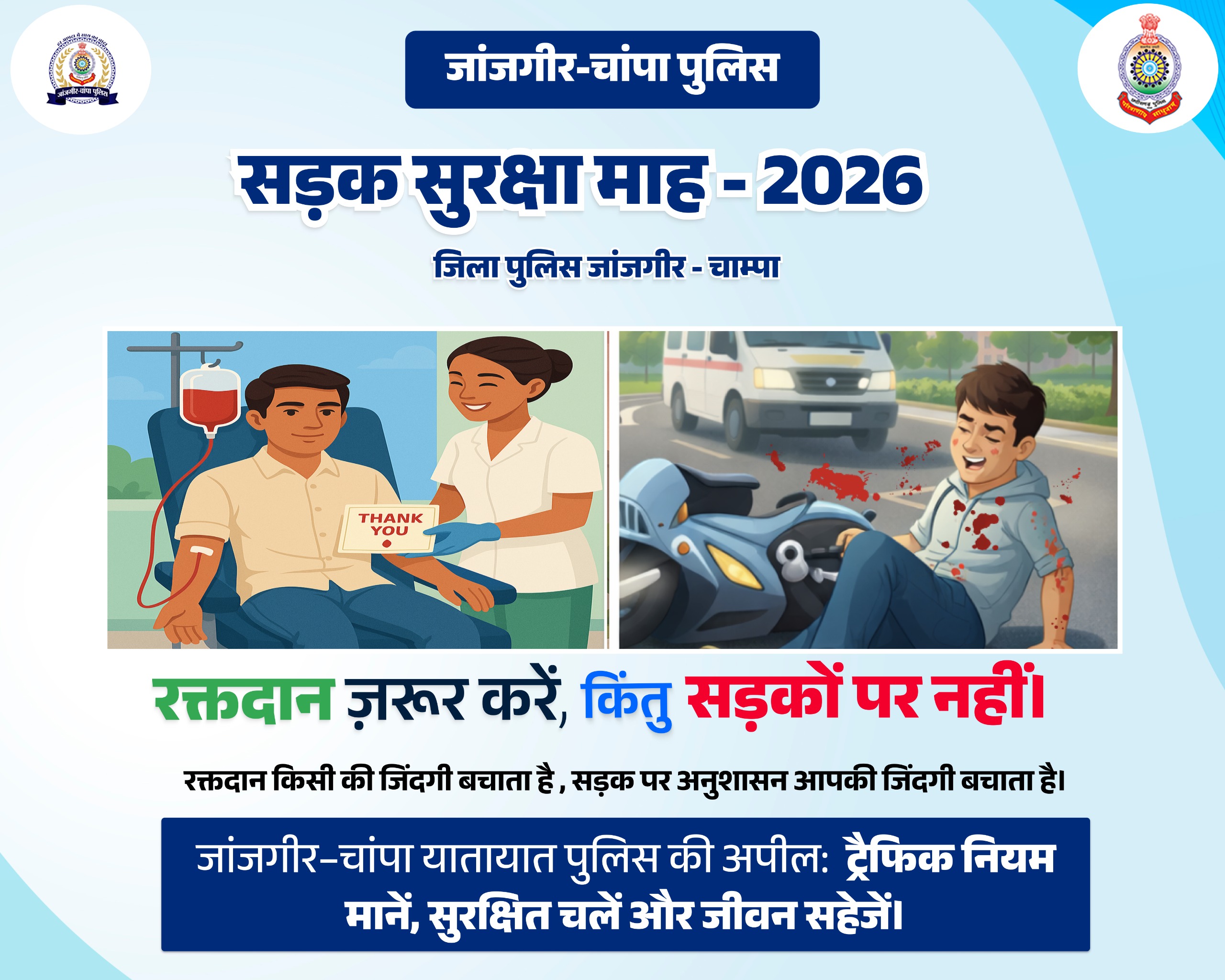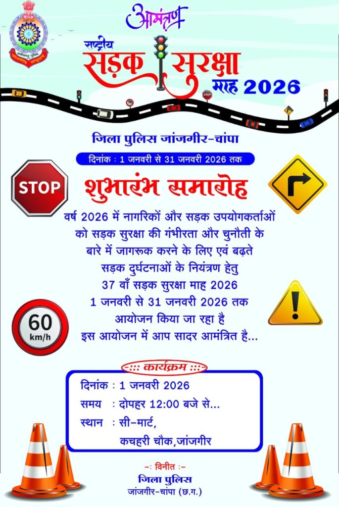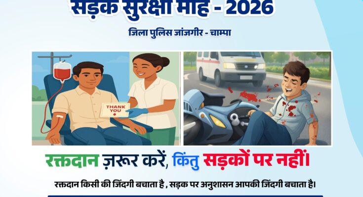जांजगीर-चांपा, 31 दिसंबर । जांजगीर-चांपा पुलिस द्वारा सड़क सुरक्षा के प्रति जनजागरूकता बढ़ाने के उद्देश्य से रक्तदान शिविर के साथ सड़क सुरक्षा माह का शुभारंभ किया जा रहा है। यह कार्यक्रम पुलिस मुख्यालय रायपुर के निर्देशानुसार आयोजित किया जा रहा है। आयोजन 01 जनवरी 2026 को दोपहर 12 बजे जांजगीर कचहरी चौक स्थित सी-मार्ट परिसर में किया जाएगा। वहीं रक्तदान शिविर की शुरुआत सुबह 10 बजे से होगी।