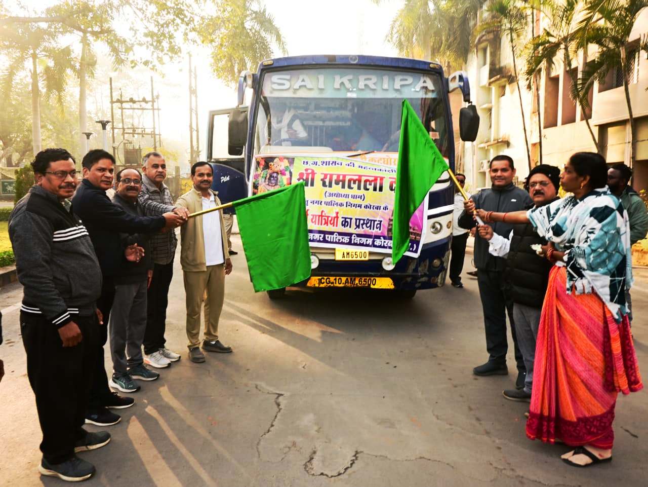 छत्तीसगढ़ सरकार की महती योजना श्रीरामलला दर्शन योजना के अंतर्गत प्रदेश के नागरिकों को पवित्र अयोध्याधाम ले जाकर भगवान श्रीरामलला जी के दर्शन प्रतिमाह कराए जा रहे हैं, जिसका सम्पूर्ण व्यय शासन द्वारा वहन किया जाता है। इसी कड़ी में इस माह भी कोरबा से 35 तीर्थयात्रियों का दल श्रीरामलला दर्शन हेतु अयोध्याधाम के लिए रवाना हुआ, यह दल बस के माध्यम से बिलासपुर के उस्लापुर रेलवे स्टेशन पहुंचा, वहॉं से विशेष ट्रेन द्वारा तीर्थयात्री अयोध्याधाम पहुंचकर श्रीरामलला जी के दर्शन का पुण्य लाभ प्राप्त करेंगे। नगर पालिक निगम कोरबा के मुख्य प्रशासनिक भवन साकेत में आज प्रातः 08 बजे सभापति श्री नूतन सिंह ठाकुर ने हरी झण्डी दिखाकर दल को रवाना किया।