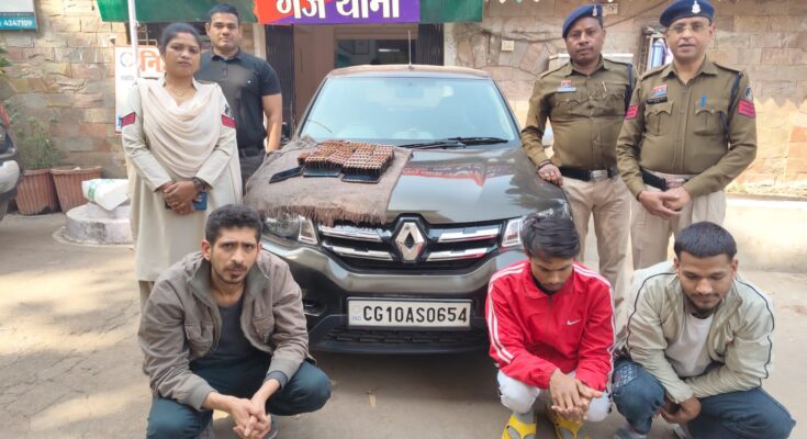 रायपुर। पुलिस महानिरीक्षक के निर्देशन एवं वरिष्ठ पुलिस अधीक्षक रायपुर के मार्गदर्शन में चलाए जा रहे विशेष अभियान “ऑपरेशन निश्चय” के तहत नशे के अवैध कारोबार के खिलाफ गंज थाना पुलिस ने बड़ी सफलता हासिल की है। पुलिस ने तीन तस्करों को गिरफ्तार कर उनके कब्जे से भारी मात्रा में नशीली गोलियां तथा एक कार जब्त की है।
