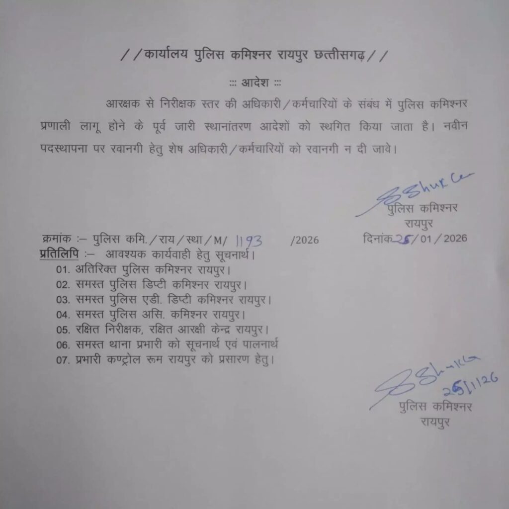इसी बीच पुलिस आयुक्त डॉ. संजीव शुक्ला ने कमिश्नरी प्रणाली के अंतर्गत आने वाले थाना क्षेत्रों को लेकर एक महत्वपूर्ण प्रशासनिक आदेश जारी किया है। आदेश के अनुसार, पुलिस आयुक्त प्रणाली लागू होने से ठीक पहले जारी किए गए पुलिस अधिकारियों और कर्मचारियों के स्थानांतरण आदेशों पर तत्काल प्रभाव से रोक लगा दी गई है।