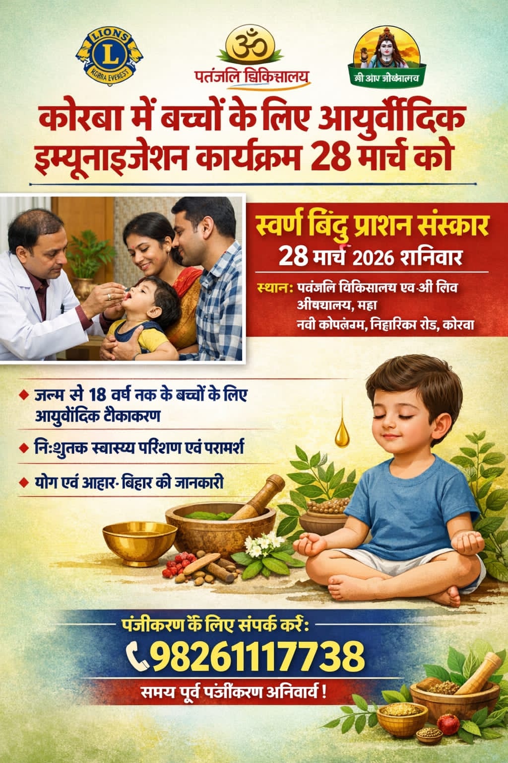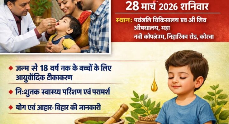 कोरबा। “चलो आयुर्वेद की ओर” मिशन के तहत शहर में बच्चों के स्वास्थ्य को बढ़ावा देने के उद्देश्य से विशेष आयुर्वेदिक इम्यूनाइजेशन कार्यक्रम का आयोजन किया जा रहा है। लायंस क्लब कोरबा एवरेस्ट, पतंजलि चिकित्सालय एवं श्री शिव औषधालय के संयुक्त तत्वाधान में “बच्चे रहे स्वस्थ” योजना के अंतर्गत यह आयोजन 28 मार्च 2026, शनिवार को अति शुभ पुष्य नक्षत्र में होगा।
