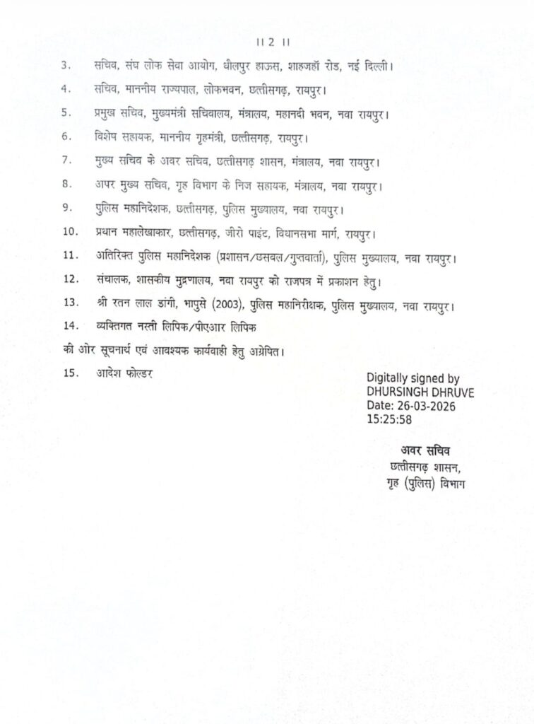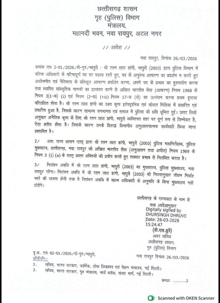 रायपुर। प्रदेश सरकार ने वरिष्ठ आईपीएस अधिकारी रतन लाल डांगी पर बड़ा प्रशासनिक एक्शन लेते हुए उन्हें निलंबित कर दिया है। गृह विभाग द्वारा जारी आदेश में यह स्पष्ट किया गया है कि हाल ही में सोशल मीडिया पर वायरल हुए आपत्तिजनक फोटो के मामले को गंभीरता से लेते हुए यह कार्रवाई की गई है।