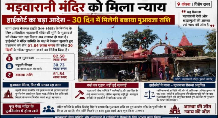 कोरबा,27 अप्रैल 2026। चांपा-उरगा नेशनल हाईवे (एनएच-149B) के निर्माण के दौरान अधिग्रहित की गई मड़वारानी मंदिर की भूमि के मुआवजे को लेकर चल रहा विवाद अब समाप्त हो गया है। हाईकोर्ट ने मंदिर समिति के पक्ष में फैसला सुनाते हुए प्रशासन को निर्देश दिया है कि शेष मुआवजा राशि 30 दिनों के भीतर भुगतान की जाए।