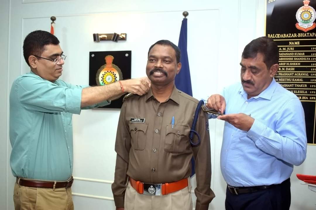 पुलिस अधीक्षक दीपक कुमार झा द्वारा स्टार लगाकर एवं कैप पहना कर दी गई बधाइयां