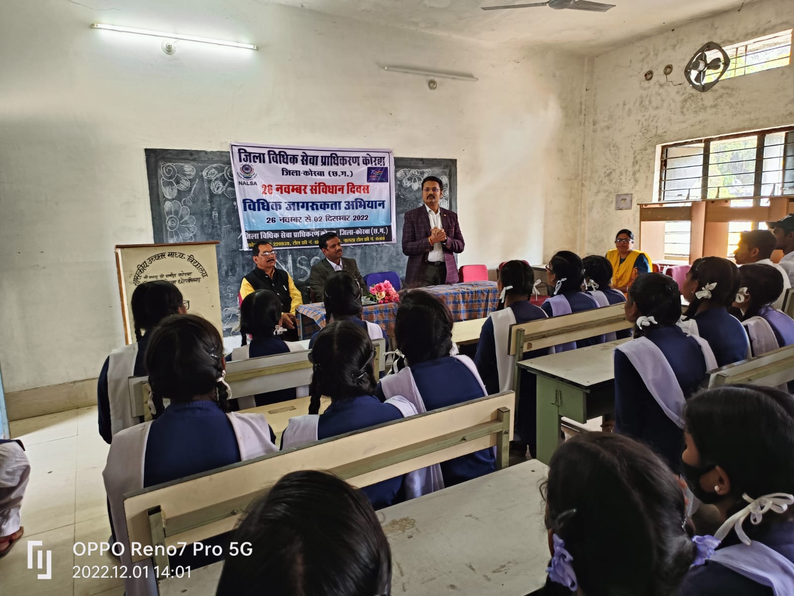 कोरबा,02 दिसंबर I राष्ट्रीय विधिक सेवा प्राधिकरण नई दिल्ली एवं छत्तीसगढ़ राज्य विधिक सेवा प्राधिकरण बिलासपुर के निर्देशानुसार 26 नवम्बर 2022 को संविधान दिवस के अवसर संविधान स्थापना उत्सव 26 नवम्बर से 02 दिसम्बर तक मनाया जा रहा है। जिला विधिक सेवा प्राधिकरण के अध्यक्ष एवं जिला न्यायाधीश डी एल कटकवार के मार्गदर्शन एवं निर्देशानुसार न्यायिक अधिकारियों के द्वारा महाविद्यालय एवं विद्यालयों में मौलिक अधिकार एवं मौलिक कर्तव्य के संबंध में जागरूकता अभियान का संचालन किया जा रहा है।
