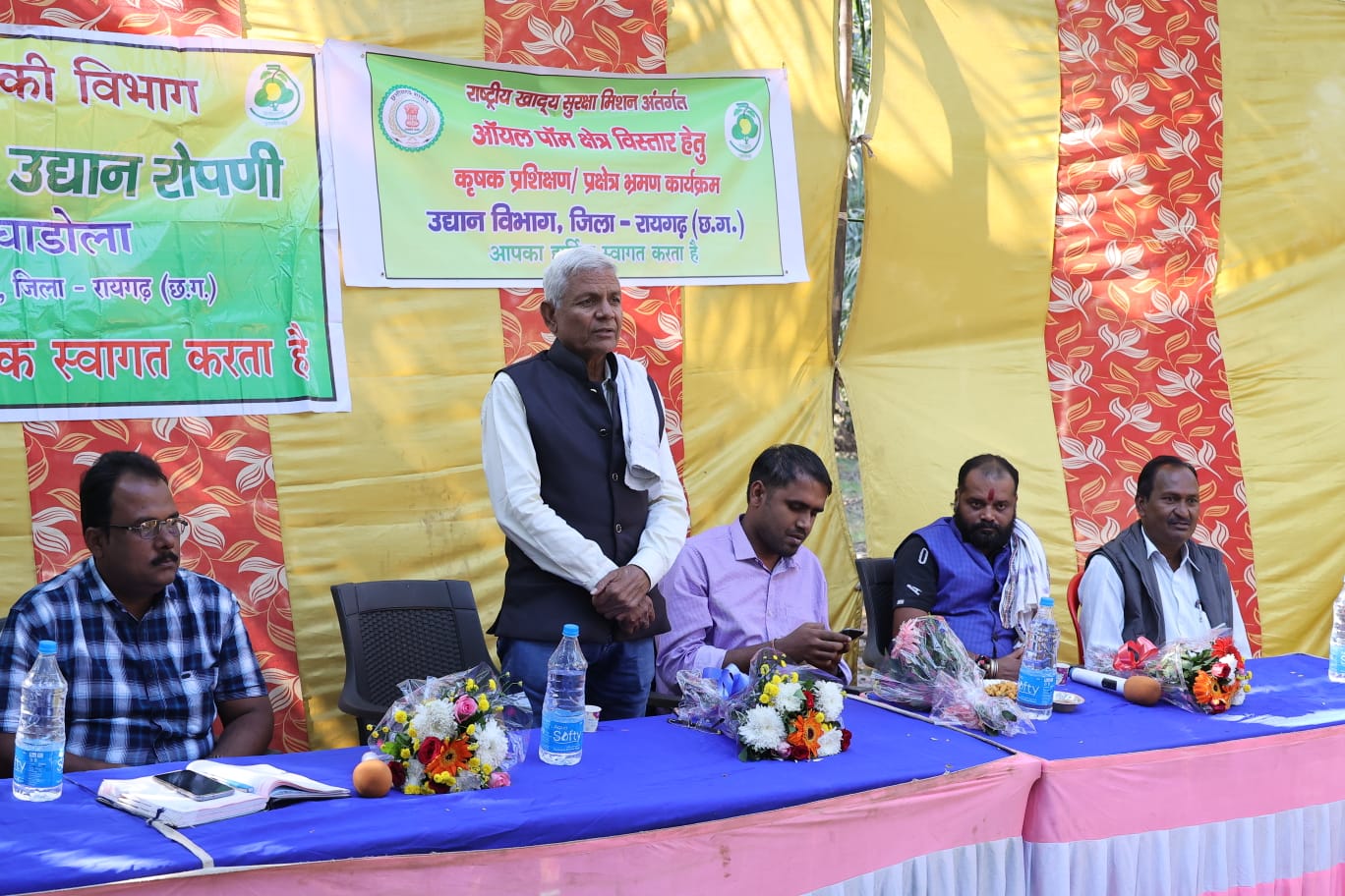 रायगढ़,05 दिसम्बर I पुसौर विकासखण्ड के ग्राम सुकुलभटली में आज जिला पंचायत अध्यक्ष निराकार पटेल के मुख्य आथित्य में ऑयल पॉम क्षेत्र विस्तार हेतु कृषक प्रशिक्षण/प्रक्षेत्र भ्रमण कार्यक्रम का आयोजन किया गया। इस अवसर पर सीईओ जिला पंचायत अबिनाश मिश्रा, जिला पंचायत सदस्य कैलाश शक्राजीत नायक भी उपस्थित रहे। ग्राम सुकुलभटली में आयोजित राष्ट्रीय खाद्य सुरक्षा मिशन अंतर्गत ऑयल पॉम क्षेत्र विस्तार हेतु कृषक प्रशिक्षण/प्रक्षेत्र भ्रमण कार्यक्रम में जिला पंचायत अध्यक्ष श्री पटेल ने कहा कि पॉम कृषि क्षेत्र में आयोजित कार्यक्रम काफी अच्छा रहा, किसानों को ऑयल पॉम कृषि से संबंधित जानकारी के साथ विजिट कराने से कृषक प्रोत्साहित होंगे। राज्य सरकार किसानों के हित में फैसले लेती है, हमारे राज्य में अन्य राज्यों से अधिक समर्थन मूल्य पर धान खरीदी होती है।