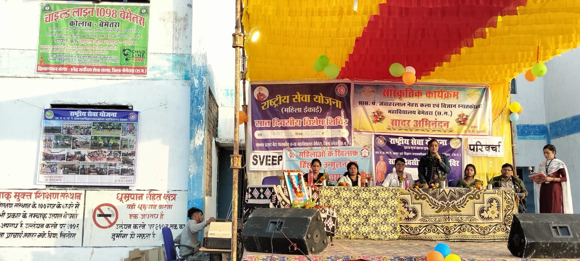 बेमेतरा,08 दिसम्बर I सखी वन स्टॉप सेंटर बेमेतरा द्वारा महिला हिंसा को समाप्त करने के उद्देश्य से कल राष्ट्रीय सेवा योजना की सात दिवसीय शिविर का आयोजन खिलोरा में किया गया। जिसमें पी.जी कॉलेज बेमेतरा एवं कन्या महाविद्यालय बेमेतरा के छात्राएं शामिल हुए। जिसमें बौद्धिक परिचर्चा कार्यक्रम में मुख्य अतिथि के रूप में कॉलेज के सहायक प्राध्यापक गण सरस्वती चौहान, जितेन्द्र बारले एवं पुन्नी केवटिया उपस्थित थे। सखी वन स्टॉप सेंटर की केंद्र प्रशासक राखी यादव ने बालक-बालिकाओं को सम्बोधित करते हुए कहा कि सखी वन स्टॉप सेंटर योजना को भारत सरकार ने 1 अप्रैल 2015 को लागू की थी।