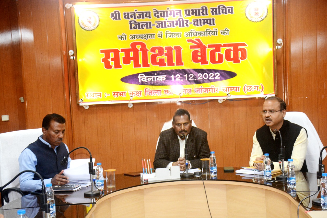 जांजगीर-चांपा,12 दिसम्बर I जिले के प्रभारी सचिव और छत्तीसगढ़ शासन के गृह, आवास एवं पर्यावरण सचिव श्री धनंजय देवांगन ने आज जिला स्तरीय अधिकारियों की बैठक लेकर शासन की योजनाओं के क्रियान्वयन की समीक्षा की। उन्होंने सभी अधिकारियों को कलेक्टर का अंग बताते हुए जिले के विकास हेतु समयबद्ध एवं पारदर्शी प्रशासन के दिशा में कार्य करने के निर्देश दिए। प्रभारी सचिव ने जांजगीर-चांपा जिले को मैदानी जिला बताते हुए स्वास्थ्य, शिक्षा, सुपोषण, रोजगार, की दिशा में बेहतर कार्य करते हुए अधिक से अधिक जरूरतमंद लोगो तक योजनाओं को पहंुचाने और उनके जीवन स्तर में बदलाव लाने कहा।