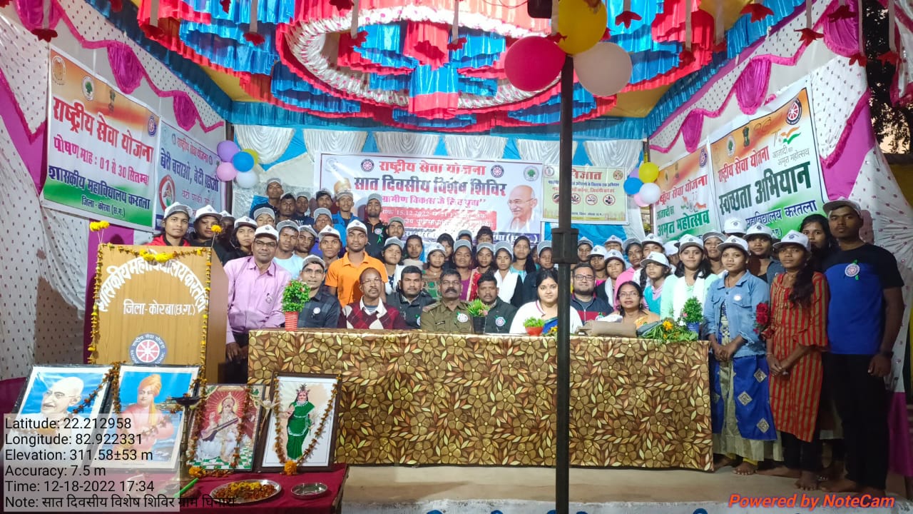 राष्ट्रीय सेवा योजना के 07 दिवसीय शिविर में ग्राम घिनारा के शास. पूर्व माध्यमिक विद्यालय में शासकीय महाविद्यालय करतला के लगभग 70 विद्यार्थियों एवं स्टाफ की उपस्थिति में चलाया गया निजात अभियान