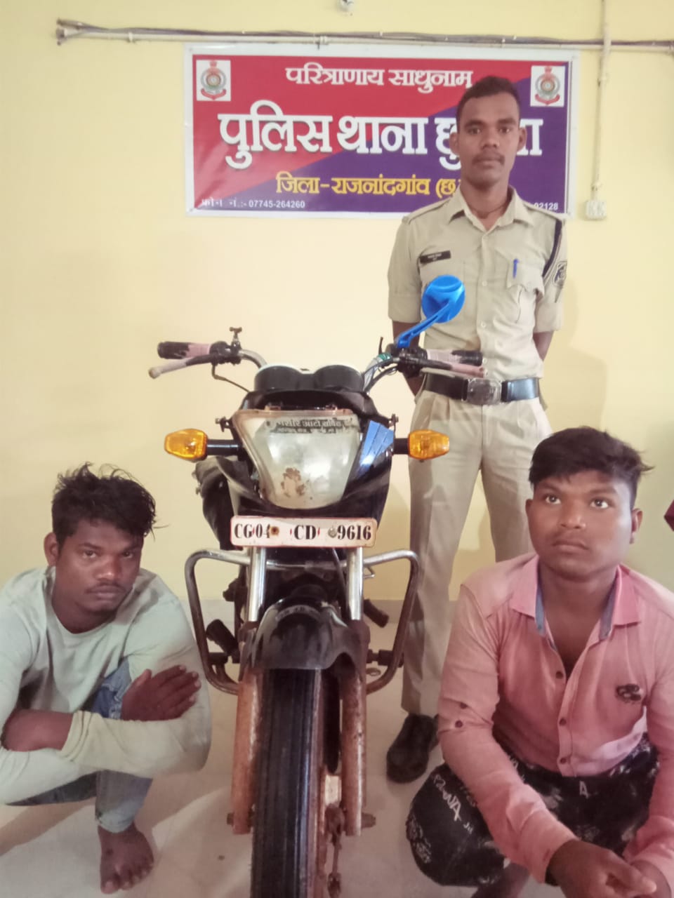 संदेहियों से नाम पता पुछने पर अपना-अपना नाम संजय ठाकुर पिता खेमू ठाुकर उम्र 22 साल निवासी ग्राम खैरी थाना साजा जिला बेमेतरा एवं करण यादव पिता स्व0 मिलन यादव उम्र 23 साल निवासी ग्राम गर्रापार थाना खैरागढ़ जिला खैरागढ़ का रहने वाला बताया जिसे हीरो होण्डा मोटरसायकल क्र0 CG 04 CD 9616 के बारे मे पुछताछ किया जो बताया की दिनांक 07/09/22 को करीबन 12/30 बजे ग्राम उदयपुर के पास से चोरी कर मोटरसायकल को बिक्री करने के लिये ग्राहक तलाश रहा है, बोलने पर मोटरसायकल की कागजात प्रस्तुत करने धारा 91 जा0फौ0 का नोटिस तामील किया जो नोटिस पर लिखित मंे दिया कि मेरे पास मोटर सायकल की कोई कागजात नही है उक्त हीरो होण्डा मोटरसायकल क्र0 CG 04 CD 9616 किमती 15,000/रुपये को मुताबिक जप्ती पत्रक समक्ष गवाहन के जप्त कर कब्जा में लिया गया मौके पर आरोपी संजय ठाकुर एवं करण यादव द्वारा जुर्म कबूल करने पर विधिवत गिरफ्तारी पत्रक तैयार कर दिनांक 11/09/2022 के 13ः05, 13ः20 बजे गिरफ्तार कर इस्तगासा क्र0 02/2022 धारा 41(1+4) जा0फौ0/379 भा0द0वि0 कायम किया गया। मामला अजमानतीय होने से ज्युडिशियल रिमाण्ड पर माननीय न्यायालय में पेश किया गया।