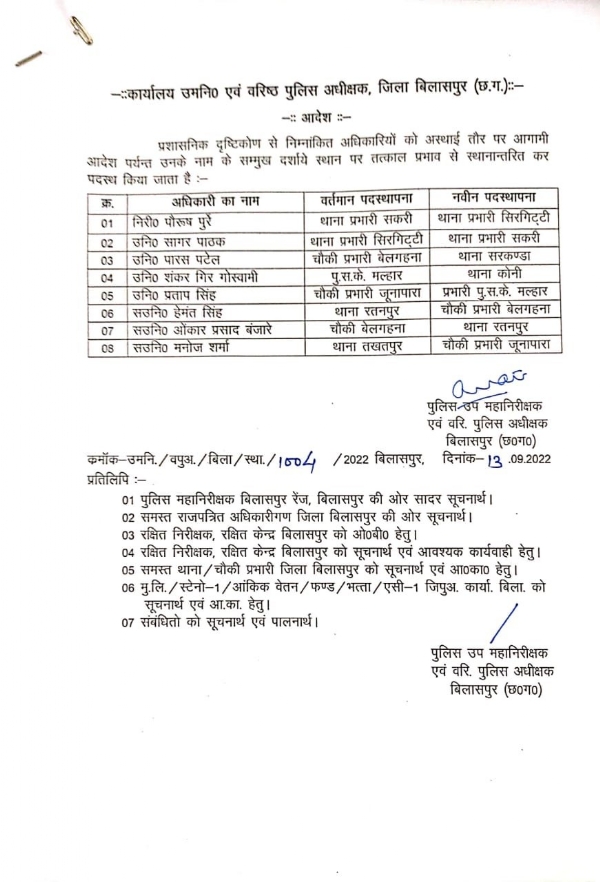 एसएसपी माथुर ने एक टीआई 4 एसआई समेत तीन एएसआई का स्थानांतरण किया है। निरीक्षक पौरुष पुर्रे को सकरी से सिरगिट्टी भेजा गया है। वहीं चर्चित सरकंडा थाने में उपनिरीक्षक पारस पटेल को बेलगहना चौकी प्रभारी से हटाकर भेजा गया है। एसआई सागर पाठक को सकरी थाने की जिम्मेदारी दी है। इसके अलावा मल्हार, बेलगहना, जुनापारा,रतनपुर, कोनी में एसआई, एएसआई को स्थानांतरित किया गया है।
