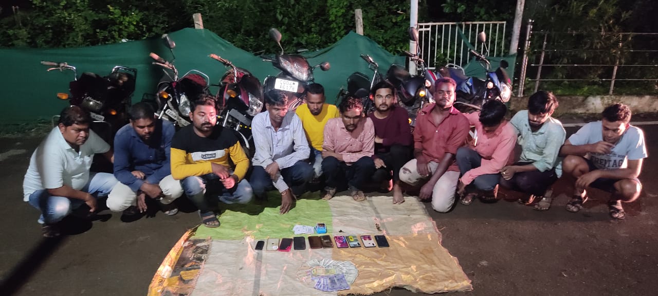 महासमुन्द, 13 सितम्बर । पुलिस अधीक्षक महासमुन्द भोजराम पटेल ने गुल जुआ, खुडखुडिया जुआ/सट्टा, अवैध शराब, अवैध गांजा परिवहन आदि संदिग्ध गतिविधयों पर रोक लगाने एवं उनके विरूध्द कार्यवाही करने हेतु जिले के समस्त थाना/चैकी प्रभारियों तथा सायबर सेल महामुन्द की टीम को निर्देशित किया गया था। जिनके तहत् थाना/चैकी क्षेत्रों में ऐसे गतिविधियों पर निगाहे रख रही थी तथा पुलिस अधीक्षक महासमुन्द, महोदय को ग्राम खरौरा नहर के किनारे क्रिकेट मैदान के आस पास आये दिन जुआ खेलने की शिकायत प्राप्त हो रही थी। कि इसी दौरान दिनांक 13.09.2022 को मुखबीर से सूचना मिली की ग्राम खरौरा के क्रिकेट मैदान के पास मंच में जुआ का फड लगा है और रूपये/पैसों का दाव लगाकर हार जीत का जुआ खेल रहे है कि सूचना को गम्भीरता से लेते हुये पुलिस अधीक्षक महासमुन्द, महोदय ने सायबर सेल महासमुन्द की टीम व सायबर सेल महासमुन्द एवं थाना सिटी कोतवाली पुलिस की टीम को पकडने हेतु निर्देशित किया। खिलाडी पुलिस पार्टी की आने की सूचना देने के लिए आने-जाने वाले रास्तों पर वाचर लगाते थे । सायबर सेल महासमुन्द की टीम व च सिटी कोतवाली पुलिस की टीम के लिए अलग-अलग टीम बनाकर बाईक व वाॅचरों से नजर बचाकर पैदल चलकर गाॅव के फड तक पहुची और चारों ओर से घेराबंदी कर 11 जुआडियों को पकडा गया।