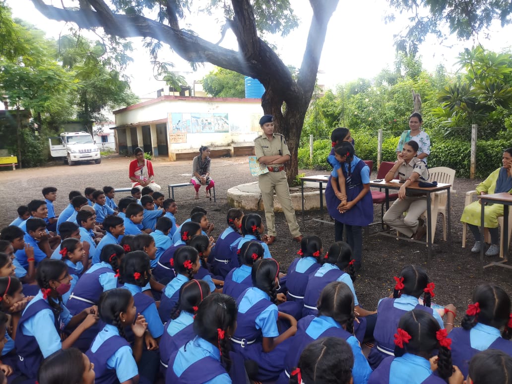 दुर्ग, 14 सितम्बर I पुलिस अधीक्षक जिला दुर्ग डॉक्टर अभिषेक पल्लव के निर्देशन एवं अतिरिक्त पुलिस अधीक्षक शहर संजय कुमार ध्रुव एवं अतिरिक्त पुलिस अधीक्षक आईयूसीएडब्ल्यू श्रीमती मीता पवार के मार्गदर्शन पर आज दिनांक 14/09/22 को शासकीय उच्चतर माध्यमिक शाला जेवरा सिरसा जिला दुर्ग के छात्र छात्राओं, को उप पुलिस अधीक्षक ,महिला विरुद्ध अपराध ,शाखा श्रीमती शिल्पा साहू के द्वारा अभिव्यक्ति कार्यक्रम के अंतर्गत child helpline number 1098 के संबंध में एवं गुड टच बैड टच, अपनी सुरक्षा सेल्फ ,मुसीबत के समय अपना बचाव कैसे करें, मोबाइल से दूरी रखें, शिक्षा के प्रति जागरूक रहकर मेहनत करने संबंधी जानकारी दी गई। सहायक उपनिरीक्षक संगीता मिश्रा रक्षा टीम के द्वारा पुलिस मुख्यालय से प्राप्त लघु फिल्मों को प्रोजेक्टर के माध्यम से उपस्थित छात्राओं, शिक्षक , शिक्षिकाओं दिखाया गया तथा उसके संबंध में विस्तृत जानकारी भी दी गई एवं अभिव्यक्ति ऐप के संबंध में विस्तृत जानकारी बच्चों और शिक्षकों दी , एवम शिक्षकों से अभिव्यक्ति एप डाउनलोड करवाया गया |कार्यक्रम में छात्रा तथा शाला के प्राचार्य एवं शिक्षक गण उपस्थित रहे l