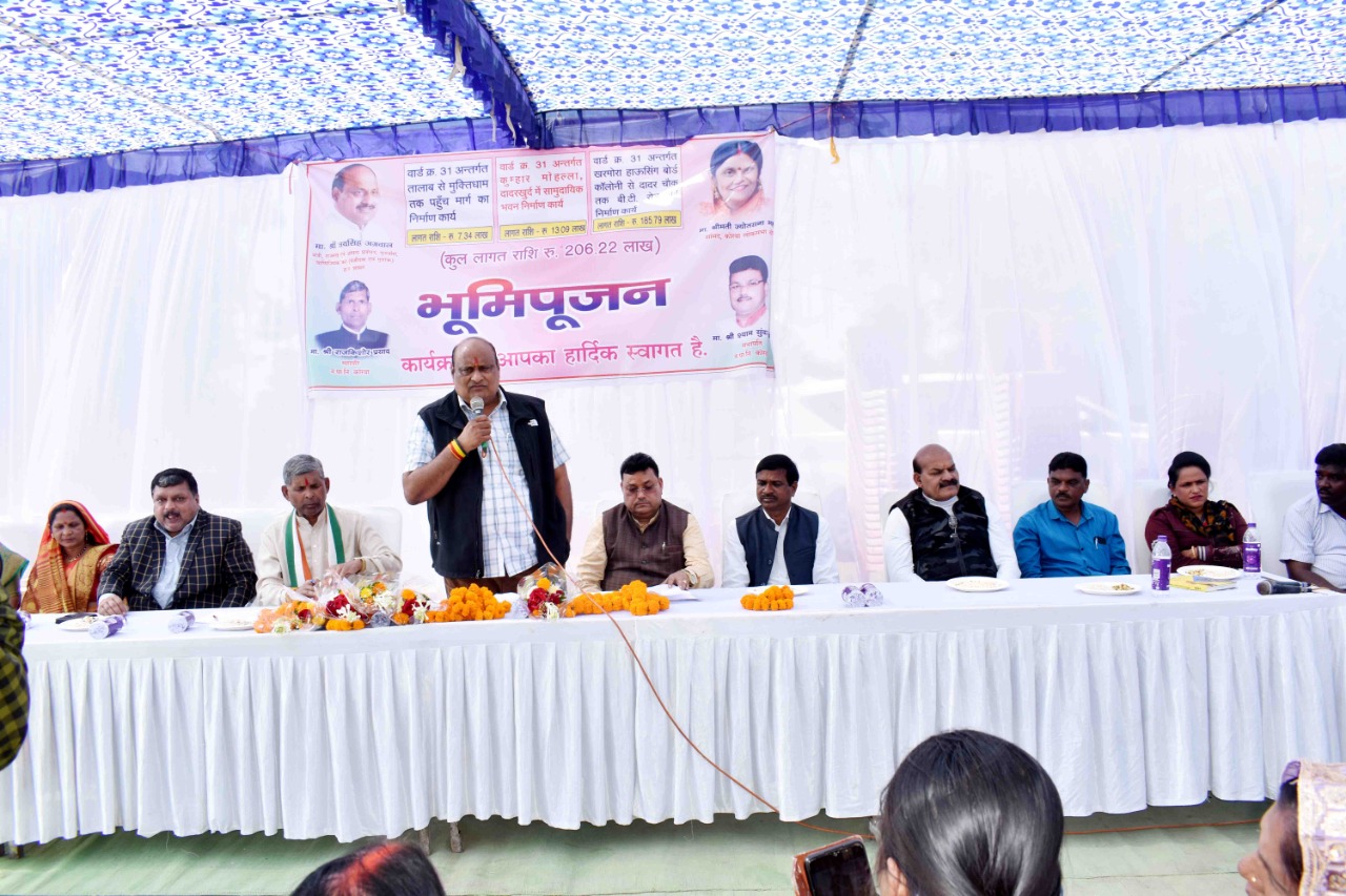 नगर पालिक निगम कोरबा द्वारा वार्ड क्र. 31 खरमोरा हाउसिंग बोर्ड कालोनी से दादर चौक तक 01 करोड 86 लाख रूपये की लागत से बी.टी.रोड का निर्माण कार्य कराया जाना हैं। इसी प्रकार वार्ड क्र. 31 में ही कुम्हार मोहल्ला दादरखुर्द में राजस्व मंत्री जयसिंह अग्रवाल के विधायक मद से 13 लाख 09 हजार रूपये की लागत से सामुदायिक भवन का निर्माण कार्य तथा वार्ड क्र. 31 मंे तालाब से मुक्तिधाम तक 07 लाख 34 हजार रूपये की लागत से पहुंच मार्ग का निर्माण कार्य सम्पन्न होना हैं।Read More : शराबी टीचर भृत्य निलंबित,जिला शिक्षा अधिकारी ने जारी किये निलंबन आदेश…. गुरूवार को दादर चौक में आयोजित भूमिपूजन कार्यक्रम के दौरान मुख्य अतिथि के रूप में अपनी गरिमामयी उपस्थिति प्रदान करते हुए प्रदेश के राजस्व एवं आपदा प्रबंधन मंत्री जयसिंह अग्रवाल ने इन सभी विकास कार्यो का विधिवत भूमिपूजन किया, शिलान्यास पट्टिका का अनावरण किया तथा कार्यो का शुभाारंभ कराया।