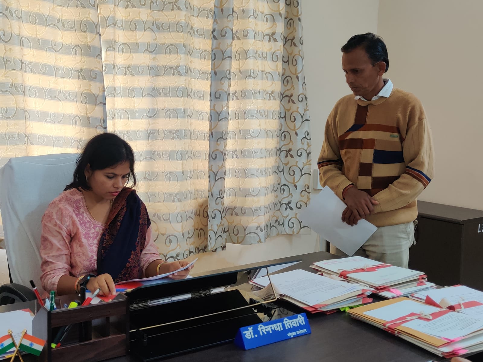 सारंगढ़-बिलाईगढ़, 02 जनवरी I कलेक्टर डॉ.फरिहा आलम सिद्दकी के निर्देशन में संयुक्त कलेक्टर डॉ.स्निग्धा तिवारी ने आज कलेक्टोरेट में जनदर्शन के माध्यम से लोगों से मिलकर उनकी समस्याएं सुनी। उन्होंने प्राप्त आवेदनों के आधार पर सभी संबंधित विभागों को समस्याओं का त्वरित निराकरण कर अवगत कराने के निर्देश दिए। इस दौरान मधाईभाठा, तहसील भटगांव के निवासी श्रीमती सियाबाई अपने पिता की मृत्यु के पश्चात् वारिस के रूप में नाम छूट जाने का कारण प्रस्तुत करते हुए नाम जुड़वाने संबंधी आवेदन लेकर आई थी, इस संबंध में तहसीलदार भटगांव को जांच कर कार्यवाही करने के निर्देश दिए। ग्राम पंचायत तिलाईपाली, बिलाईगढ़ की निवासी शांति कुमारी ने मनरेगा में मेट का कार्य प्रदान करने हेतु आवेदन किया।