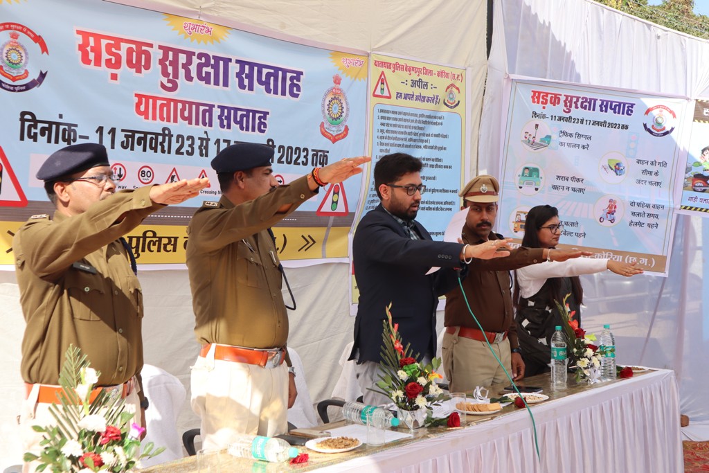 कोरिया,12 जनवरी I सड़क परिवहन एवं राजमार्ग मंत्रालय भारत सरकार के निर्देश पर 11 से 17 जनवरी तक सड़क सुरक्षा सप्ताह का आयोजन किया जा रहा है। आज जिला मुख्यालय बैकुण्ठपुर बस स्टैण्ड में सड़क सुरक्षा सप्ताह जागरूकता हेतु शुभारम्भ कार्यक्रम का आयोजन किया गया। कार्यक्रम में कलेक्टर विनय कुमार लंगेह, एसपी त्रिलोक बंसल, जिला पंचायत सीईओ श्रीमती नम्रता जैन ने लोगों को सड़क सुरक्षा से संबंधित नियमों की जानकारी दी तथा सुरक्षा नियमों का पालन करने अपील की। इस दौरान यातायात जागरूकता रथ को हरी झण्डी दिखाकर रवाना किया गया, जागरूकता रथ सड़क सुरक्षा सप्ताह के दौरान विभिन्न स्थानों पर यातायात नियमों के प्रति लोगों को जागरुक करेगा। कार्यक्रम में जिला तथा पुलिस प्रशासन के अधिकारी कर्मचारी, एनसीसी कैडेट, वाहन चालक तथा आमजन मौजूद थे।