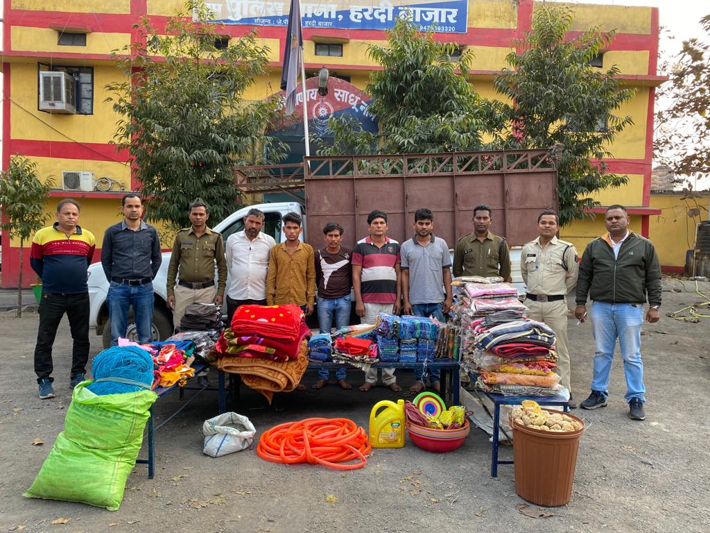 बिलासपुर मामले का संक्षिप्त विवरण इस प्रकार है कि दिनांक 07.01.2023 को प्रार्थी मनमोहन राठौर पिता रमेश कुमार राठौर उम्र 23 वर्ष निवासी ग्राम लोटनापारा उतरदा चौकी हरदीबाजार थाना कुसमुण्डा द्वारा रिपोर्ट दर्ज कराया कि दिनांक 06.01.2023 को लगभग 01ः00 बजे से 03ः00 बजे के मध्य अज्ञात चोरों के द्वारा प्रार्थी के दुकान की गोदाम में रखा समान जिसमें स्कूल ड्रेस, गरम कपड़ा, रेडिमेड व होजियारी कपड़ा, किराना समान, हार्डवेयर का समान आदि को चोरी कर ले गये हैं,प्रार्थी की रिपोर्ट पर अपराध क्रमांक 11/2023 धारा 457, 380 भादवि. कायम कर हालात से पुलिस अधीक्षक कोरबा श्री संतोष सिंह (भा.पु.से.), अतिरिक्त पुलिस अधीक्षक कोरबा श्री अभिषेक वर्मा (रा.पु.से.), नगर पुलिस अधीक्षक दर्री श्री रोबिनसन गुड़िया (भा.पु.से.) को अवगत कराकर मार्गदर्शन प्राप्त करने पर मार्गदर्शन प्रदान करते हुए आरोपियों की त्वरित गिरफ्तारी हेतु निर्देशित किया गया। प्रकरण की विवेचना के दौरान घटना स्थल के आसपास लगा सीसी टीवी कैमरा का फुटेज लेकर बारिकी से अवलोकन किया गया एवं घटना स्थल का टीडीआर व संदेहियों के मोबाईल का सीडीआर आदि का विष्लेषण करने पर उपरोक्त आरोपियों का लोकेषन ग्राम चिरौटी थाना सरगांव जिला मुंगेली का होना पाया गया। ग्राम चिरौटी में आरोपियों व ग्रामीणों द्वारा पूर्व में भी पुलिस बल पर हमला कर आरोपियों को बचाने का प्रयास किया गया था, जिस पर मामले की गंभीरता को देखते हुए श्रीमान नगर पुलिस अधीक्षक महोदय रोबिनसन गुड़िया (भा.पु.से.) के नेतृत्व में जिला कोरबा सायबर सेल टीम प्रभारी निरीक्षक श्री मनीष नागर व सायबर सेल की टीम ,जिला की विशेष महिला टीम,चौकी हरदीबाजार स्टाफ एवं थाना सरगांव, थाना पथरिया का बल के साथ दिनांक 15.01.2023 को ग्राम चिरौटी थाना सरगांव जिला मुंगेली में दबिश देकर आरोपीगण को अभिरक्षा में लेकर पूछताछ करने पर दिनांक घटना को चोरी करना स्वीकार किये। आरोपियों से चोरी गये मषरूका को बरामद कर जप्त किया गया है। प्रकरण में आरोपी विजय पात्रे उर्फ पिंटू व अनुप जोषी दोनों निवासी ग्राम चिरौटी थाना सरगांव जिला मुंगेली फरार है जिनका पता तलाष किया जा रहा है। उपरोक्त आरोपियों को गिरफ्तार कर न्यायिक रिमाण्ड पर भेजा गया। उपरोक्त कार्यवाही नगर पुलिस अधीक्षक दर्री श्री रोबिनसन गुड़िया के नेतृत्व में निरीक्षक मनीष नागर सायबर सेल प्रभारी एवं सायबर सेल की टीम,उप निरीक्षक मयंक मिश्रा और चौकी हरदीबाजार की टीम, जिला कोरबा की विशेष महिला टीम,जिला मुंगेली के उप निरीक्षक अमित कौशिक व थाना पथरिया व थाना सरगांव के बल की महत्वपूर्ण भूमिका रही।