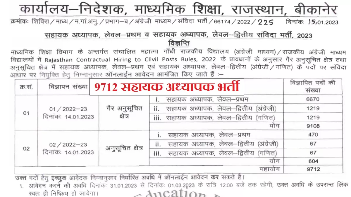एजुकेशन ,17 जनवरी I राजस्थान शिक्षक भर्ती या राजस्थान सहायक अध्यापक भर्ती के मौकों का इंतजार कर रहे उम्मीदवारों के लिए काम की खबर। राजस्थान सरकार के माध्यमिक शिक्षा निदेशक कार्यालय बीकानेर द्वारा माध्यमिक शिक्षा विभाग के अंतर्गत संचालित महात्मा गांधी राजकीय विद्यालय (अंग्रेजी माध्यम) / राजकीय अंग्रेजी माध्यम विद्यालयों में सहायक अध्यापक लेवल – प्रथम और सहायक अध्यापक लेवल – द्वितीय (अंग्रेजी/गणित) के पदों पर संविदा के आधार पर भर्ती के लिए अधिसूचना जारी की गई है। निदेशक कार्यालय द्वारा रविवार, 15 जनवरी 2023 को जारी विज्ञप्ति के अनुसार राजस्थान के गैर-अनुसूचित क्षेत्रों में सहायक अध्यापक लेवल 1 के 6670 पदों, सहायक अध्यापक लेवल – द्वितीय अंग्रेजी के 1219 पदों और सहायक अध्यापक लेवल – द्वितीय गणित के 1219 पदों समेत कुल 9108 पदों पर भर्ती की जानी हैं। इसी प्रकार, राज्य के अनुसूचित क्षेत्रों में सहायक अध्यापक लेवल 1 के 470 पदों, सहायक अध्यापक लेवल – द्वितीय अंग्रेजी के 67 पदों और सहायक अध्यापक लेवल – द्वितीय गणित के 67 पदों समेत कुल 604 पदों पर भर्ती की जानी हैं।