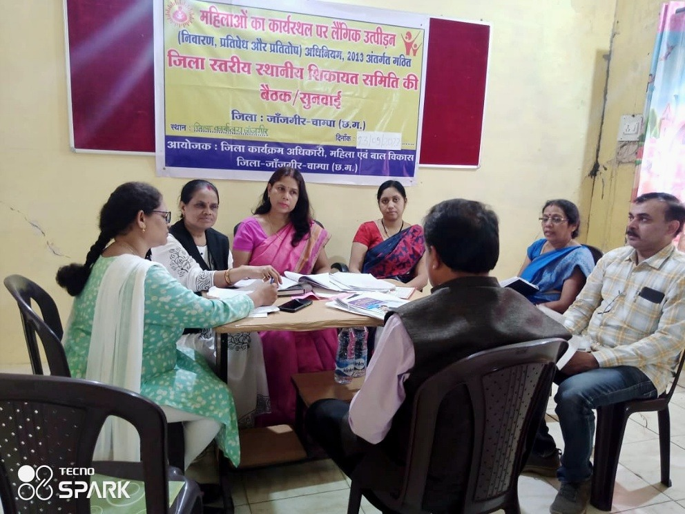 जांजगीर-चांपा, 26 सितम्बर I महिलाओं का कार्यस्थल पर लैगिंक उत्पीड़न (निवारण, प्रतिषेध और प्रतितोष) अधिनियम 2013 की धारा -06(1) के अंतर्गत गठित जिला स्तरीय स्थानीय शिकायत समिति की बैठक संपन्न। बैठक में समिति की अध्यक्ष श्रीमती तान्या अनुरागी पाण्डेय, सदस्यगण श्रीमती रिषीकान्ता राठौर, श्रीमती नम्रता राघवेन्द्र नामदेव, श्रीमती विजयलक्ष्मी सोनी, जिला महिला एवं बाल विकास अधिकारी श्री सूर्यकान्त गुप्ता, श्रीमती संरक्षण अधिकारी अनुपमा सिंह कवंर की उपस्थिति में संपन्न हुई। बैठक में प्राप्त प्रकरण पर पक्षकारों से पूछताछ करते हुए कार्रवाई की गई।
