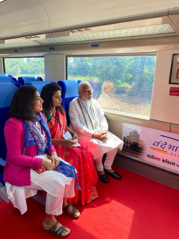 इससे पहले प्रधानमंत्री मोदी ने गांधीनगर से अहमदाबाद के लिए वंदे भारत एक्सप्रेस ट्रेन में यात्रा की। प्रधानमंत्री कार्यालय के अनुसार इस यात्रा में रेलवे परिवार, महिला उद्यमियों और युवाओं सहित जीवन के विभिन्न क्षेत्रों के लोग उनके सहयात्री बने।