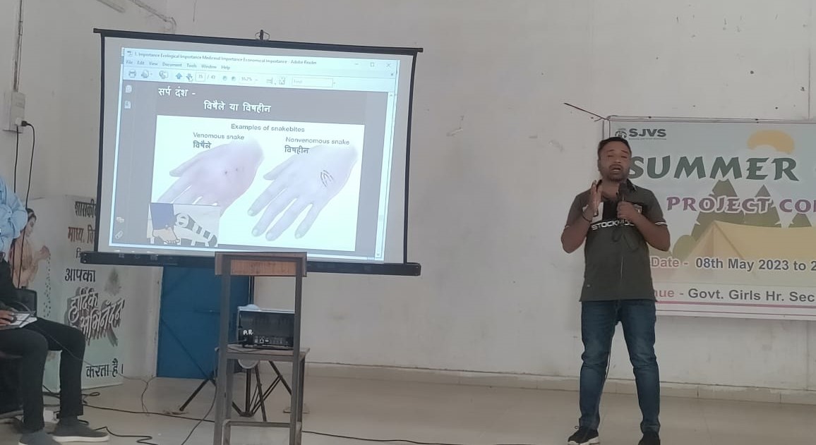 प्रोजेक्टर के माध्यम से सभी बच्चों को हाथी, भालू, बाघ, चिड़ियो के साथ जहरीले सांपो की भी जानकारी दी गई, साथ ही बताया गया सर्प दंश होने पर हमें मेडीकल ईलाज करवाना चाहिए न की झाड़ फूंक, समय रहते हस्पताल पहुंच जानें में ही हमारी ज़िंदगी बच सकती हैं, इस तरह के कार्यक्रमों से निश्चित ही बच्चों में जागरूकता पैदा होगी और पर्यावरण संरक्षण में आपनी विशेष भूमिका निभाएंगे, इस कैंप में बड़ी संख्या में बच्चों के साथ वन परिक्षेत्र बालको के बीएफओ चेतन ध्रू, ज्योतिष राठिया, प्रोजेक्ट कॉर्डिनेटर भीखम लाल पटेल, मुकुल प्रसाद चौहान, सुमन यादव, राहुल यादव उपस्थित रहे।