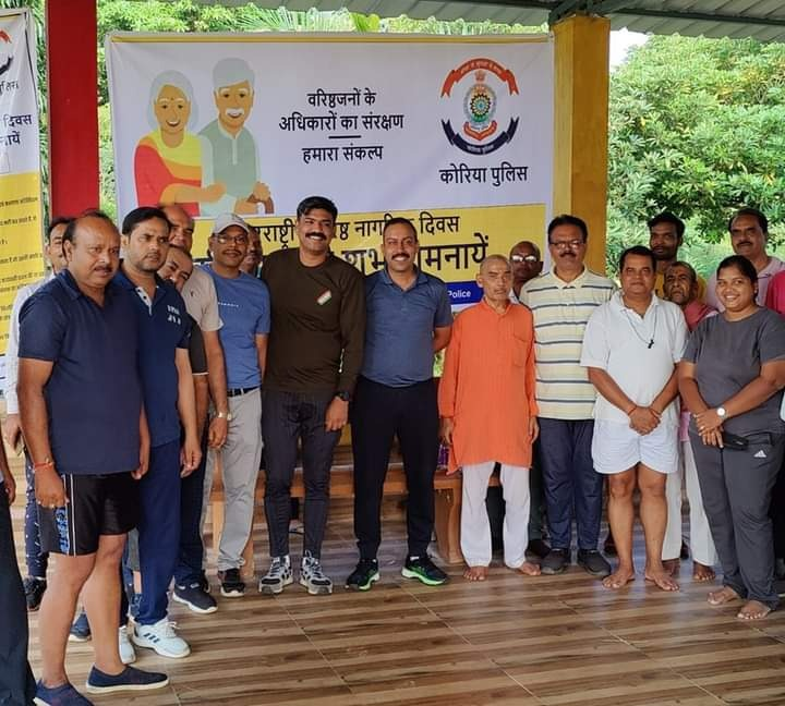 कोरिया, 01 अक्टूबर । पुलिस अधीक्षक कोरिया त्रिलोक बंसल की उपस्थिति में अतिरिक्त पुलिस अधीक्षक रोहित कुमार झा के द्वारा आज अंतरराष्ट्रीय वृद्धजन दिवस के अवसर पर प्रातः 7:00 बजे नगर के इंदिरा पार्क में वृद्ध जनों के साथ अंतरराष्ट्रीय वृद्धि वृद्धजन दिवस मनाया गया । आज इस अवसर पर सुबह-सुबह सैर पर निकले वरिष्ठ जनों एवं अन्य लोगों के साथ पुलिस अधीक्षक महोदय ने वरिष्ठ जनों के लिए बनाए गए कानून की जानकारी दी साथ ही साथ उनका कुशल क्षेम जाना । इस दौरान आपसी परिचर्चा में शहर के विषय में कई बिंदु सामने आए जिसमें पुलिस अधीक्षक महोदय द्वारा सभी विचारों एवं सुझाव को आगामी दिवस में समाधान हेतु आश्वस्त किया गया । किसी भी प्रकार की सूचना या परेशानी की स्थिति में तत्काल पुलिस से संपर्क करने की बात कहीं गई । इस अवसर पर अतिरिक्त पुलिस अधीक्षक द्वारा वृद्धजनों के अधिकारों के संबंध में जानकारी दी गई । कार्यक्रम का आभार प्रदर्शन डीएसपी कविता ठाकुर के द्वारा किया गया इस दौरान थाना बैकुंठपुर का पुलिस अमला उपस्थित रहा ।