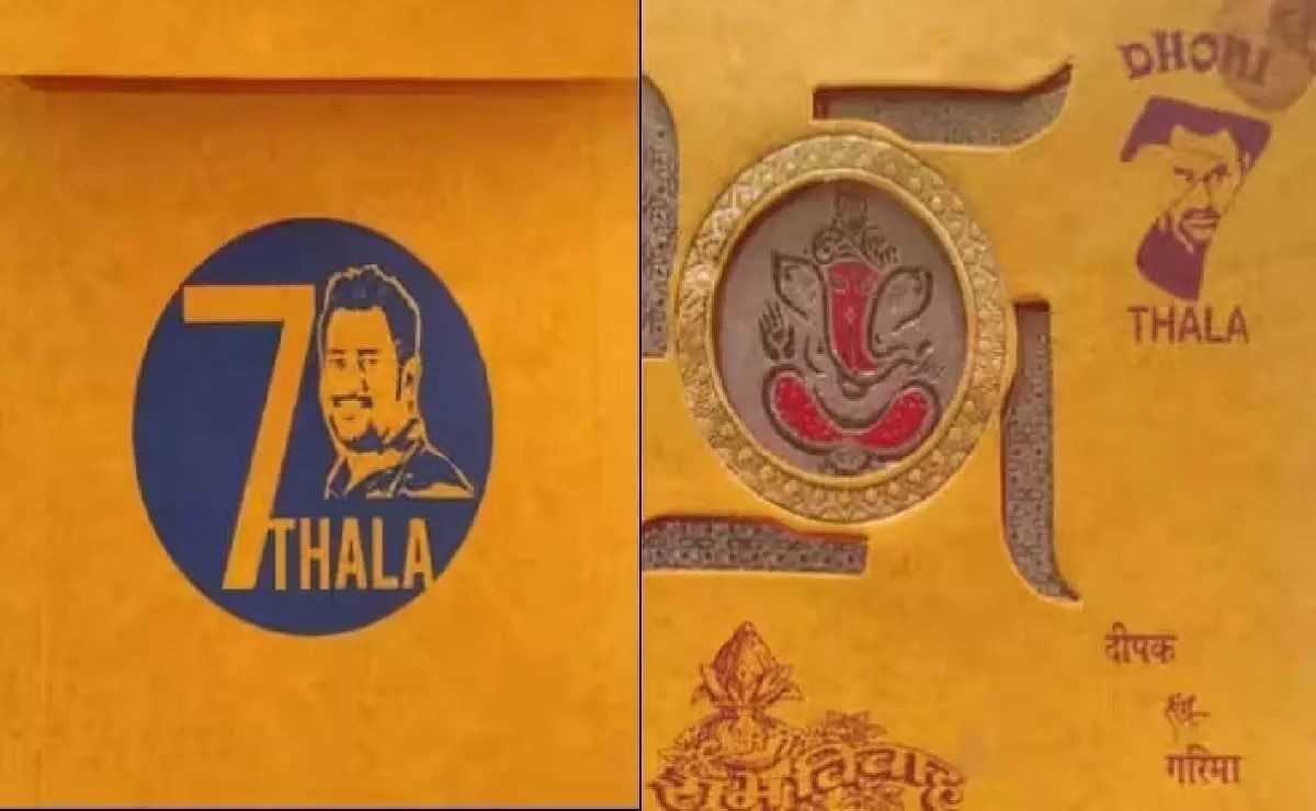 सोशल मीडिया पर एक शादी का कार्ड वायरल हो रहा है जिसमें एक शख्स ने धोनी के फोटो के साथ ही जर्सी नंबर और उनका नाम प्रिंट करवाया गया है। धोनी के जर्सी का नंबर 7 लिखवाया गया है साथ ही पूरे कार्ड को पीले रंग से रंगा गया है। धोनी चेन्नई सुपर किंग के कप्तान हैं और CSK की जर्सी भी पीले रंग की है।