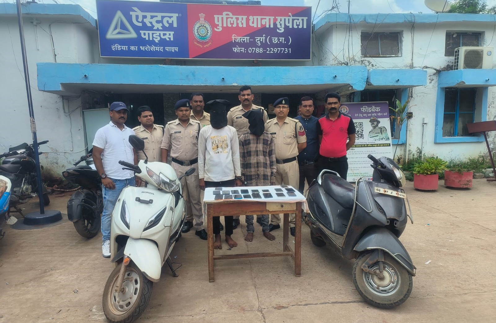 इसी दौरान मुखबीर सूचना व हुलिया के आधार पर संदेही एस. सचिन उर्फ जहर एवं आदित्य यादव उर्फ डंपी को पूछताछ करने पर पहले तो वह पुलिस को गुमराह करते रहे। पुलिस के पूछताछ पर ज्यादा देर टिक नही पाये और अपना जुर्म स्वीकारते हुए बताये कि थाना सुपेला, स्मृति नगर, वैशाली नगर, मोहन नगर, भिलाई भट्टी आदि स्थानो से मोबाईल छिन्तई करना स्वीकार किये। आरोपीगणों के कब्जे से छिन्तई के 20 नग मोबाईल एवं घटना में प्रयुक्त वाहन एक्टीवा वाहन को सुपेला पुलिस ने जप्त किया है।