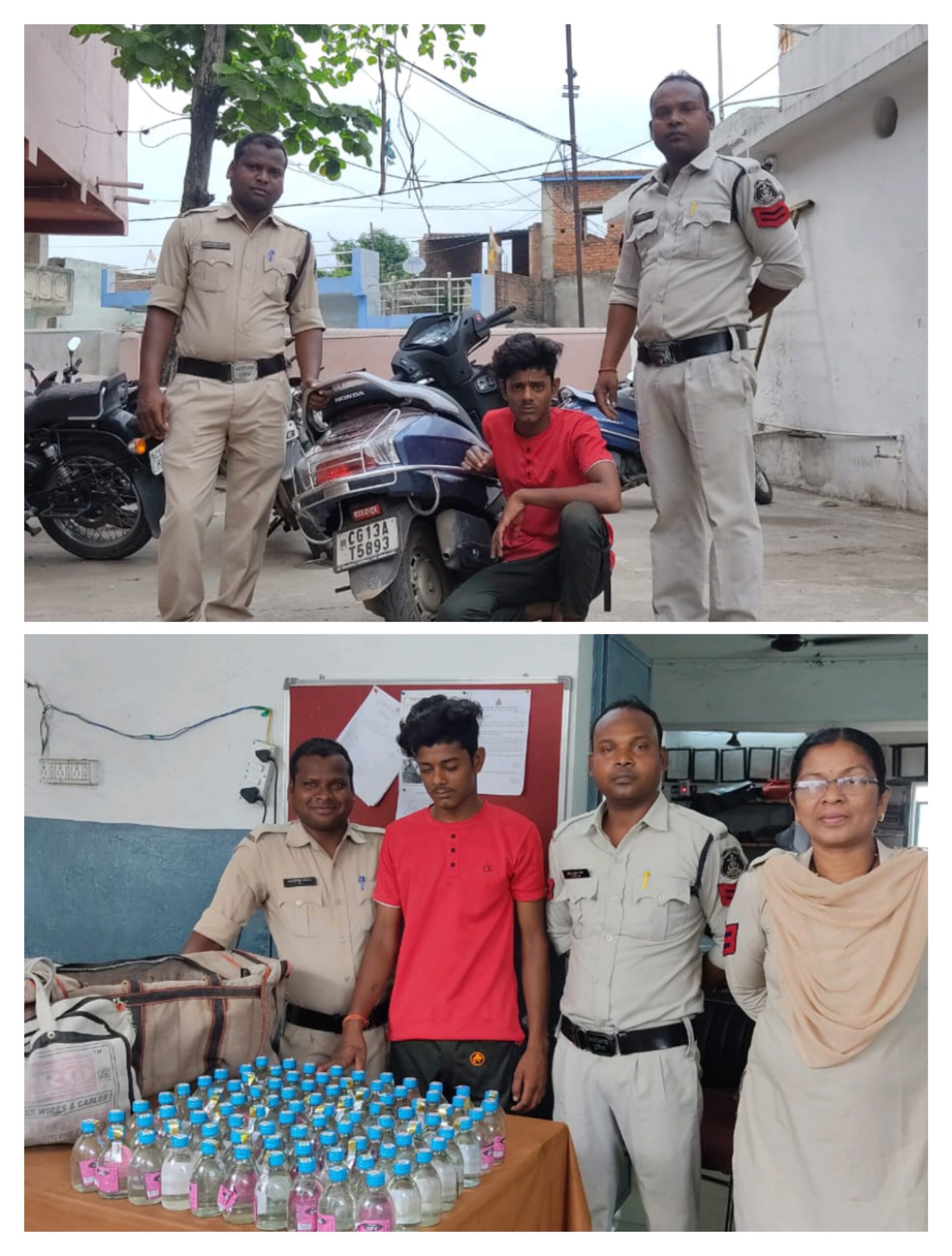 सूचना पर तत्काल टीआई जूटमिल द्वारा कार्रवाई के लिये थाने की पेट्रोलिंग को सावित्री नगर, भजनडीपा की ओर रवाना किया गया । जूटमिल पेट्रोलिंग द्वारा संदिग्ध स्कूटी का पता लगाते हुए भजनडीपा बजरंग बली चौक के पास स्कूटी पर शराब परिवहन कर रहे युवक को पकड़ी , स्कूटी का चालक *पुरन साहू पिता स्व सुखीराम साहू 20 साल सा नावापारा वार्ड क्रमांक 34 थाना जूटमिल* के स्कूटी पर रखा 90 पाव देशी प्लेन/मशाला शराब किमती 7,200 रूपये एवं शराब परिवहन में प्रयुक्त एक पुरानी इस्तेमाली होण्डा कंपनी का एक्टीवा 125 स्कूटी नीला रंग का जिसका नम्बर प्लेट में CG-13-AT-5893 लिखा हुआ है किमती 30,000 रूपये *जुमला किमती 37200 रूपये की जप्ती* की गई है ।