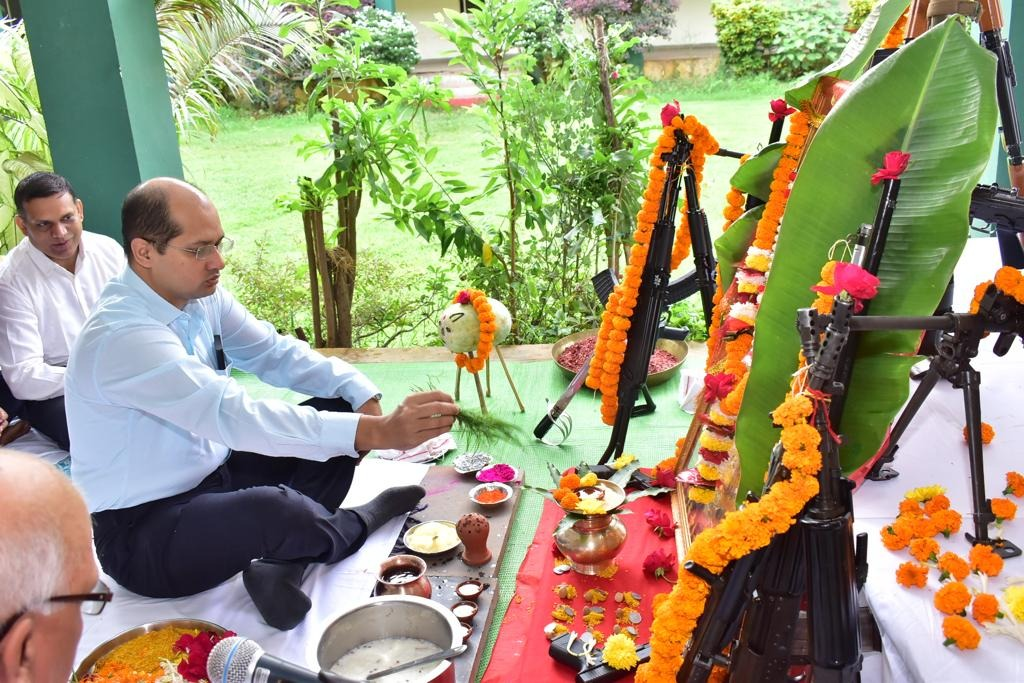 दुर्ग 05 अक्टूबर,को पुलिस लाइन जिला- दुर्ग के शस्त्रागार में विजयदशमी के अवसर पर शस्त्र पूजा का आयोजन किया गया। शस्त्र पूजा मे डॉ अभिषेक पल्लव (भा• पू• से•) पुलिस अधीक्षक जिला- दुर्ग के द्वारा माता दुर्गा जी की पूजा एवं शस्त्रों की पूजा सुबह पंडित जी के मंत्र उच्चारण के साथ की गई पूजा की परंपरा विधि विधान से संपन्न होने के बाद पुलिस अधिकारियों के द्वारा हवाई फायरिंग की जाकर समस्त अधिकारी /कर्मचारियों को विजयदशमी की शुभकामनाएं दी गई तत्पश्चात वाहन शाखा रक्षित केंद्र दुर्ग में वाहनों की पूजा की गई ।