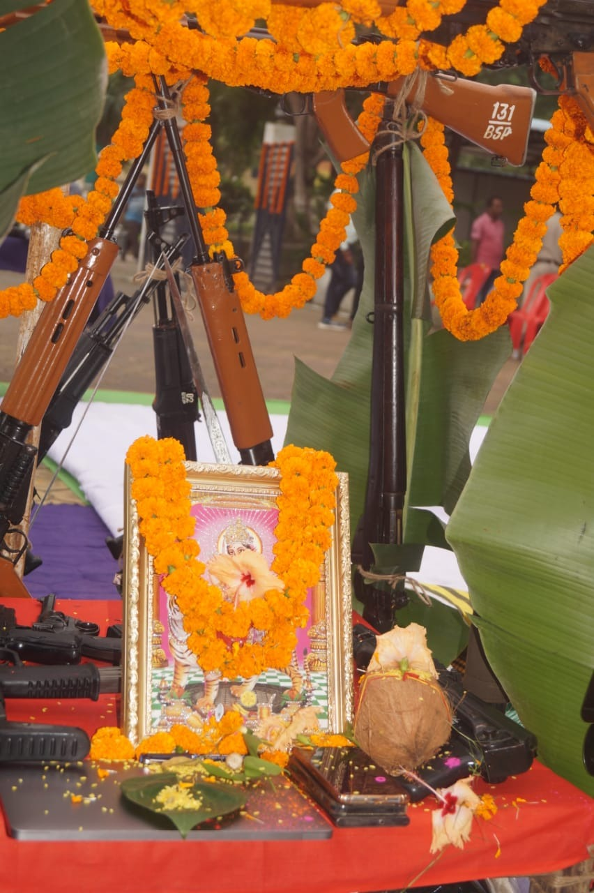 बिलासपुर ,05 अक्टूबर I प्रतिवर्ष दशहरा पर्व के अवसर पर बिलासपुर पुलिस द्वारा शस्त्र पूजा करने की परंपरा रही है। इसी परंपरा अनुसार आज दिनांक 05.10.2022 को दशहरा पर्व के पावन अवसर पर बिलासपुर पुलिस के द्वारा रक्षित केंद्र में शस्त्र पूजा का आयोजन किया गया, जिसमें जिले की उप महानिरिक्षक एवं वरिष्ठ पुलिस अधीक्षक श्रीमती पारुल माथुर ने सपरिवार पूजा में सम्मिलित हो कर जिले के अन्य पुलिस अधिकारी, कर्मचारियों के साथ विधि विधान से शक्ति स्वरूपा मां दुर्गा एवं शस्त्रों पूजन किया । शस्त्रों की पूजा के पश्चात वाहनों की भी पूजा की गई। इस अवसर पर वरिष्ठ पुलिस अधीक्षक एवं अन्य अधिकारियों द्वारा ब्लैंक राउंड से हवाई फायर भी किया गया। वरिष्ठ पुलिस अधीक्षक श्रीमती पारुल माथुर ने क्षेत्रवासियों को दशहरा की शुभकामनाएं दी