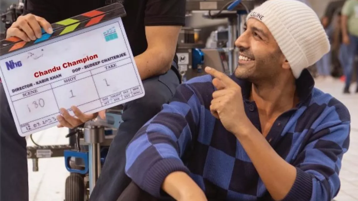 कार्तिक आर्यन तस्वीर में ब्लैक जॉगर्स, व्हाइट कैप के साथ ब्लू और ब्लैक चेक कार्डिगन में नजर आ रहे हैं। साथ ही कार्तिक चंदू चैंपियन के पहले टेक के लिए क्लैपबोर्ड की तरफ इशारा करते हुए दिख रहे हैं, जिसे कबीर खान ने पकड़ा हुआ है और दोनों मुस्कुरा रहे हैं।