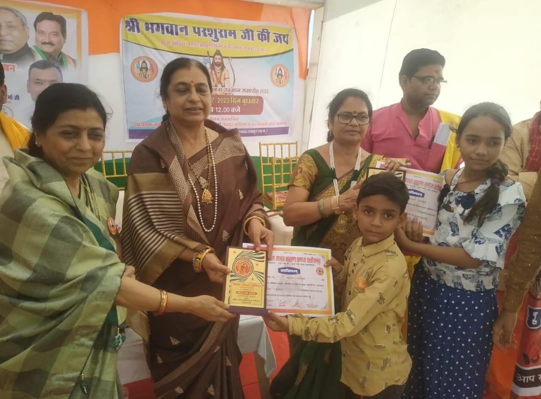 तत्पश्चात बच्चों का 80% से अधिक अंक प्राप्त कर 10वीं 12वीं स्नातक स्नातकोत्तर पर अर्जित करने पर प्रमाण पत्र व प्रतीक चिन्ह देकर सम्मानित किया गया | सभी सम्मानित अतिथि को प्रदेश संयोजक व प्रकोष्ठ मेघराज तिवारी प्रदेश अध्यक्ष सूर्यकांत महाराज जिला अध्यक्ष हेमराज शर्मा द्वारा पुष्पगुच्छ व मोमेंटो देकर स्वागत व सम्मान किया गया | पंकज शर्मा ने संबोधित करते हुए कहा कि विप्र समाज को एक साथ संगठित होकर कार्य करने की अपील करता हूं वह समाज को समाज अनुकूल सभी वर्गों का सम्मान करते हुए भी अपने आचरण के अनुसार जनकल्याण के कार्यों में लगे रहने व सर्वे कल्याण की भावना बनाए रखने को भी प्रथम अनुकूल बताया |
