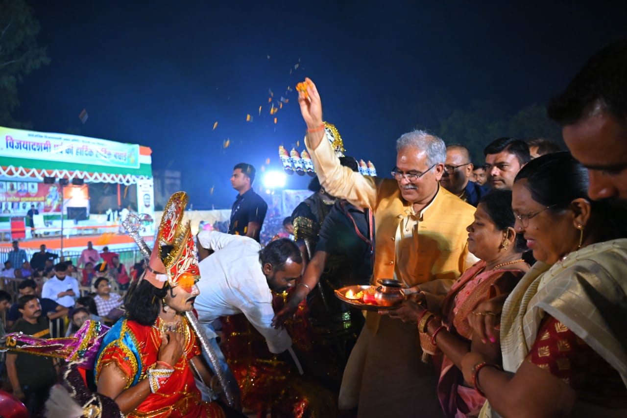 दुर्ग ,06 अक्टूबर । मुख्यमंत्री भूपेश बघेल भिलाई 03 के बिजली नगर में सार्वजनिक विजयदशमी उत्सव समिति द्वारा आयोजित दशहरा कार्यक्रम में रावण दहन के लिए पहुंचे। उनकी उपस्थिति में असत्य और बुराई के प्रतीक 30 फीट ऊंचाई के रावण के पुतले का दहन किया गया। मैदान में आतिशबाजी का प्रदर्शन भी हुआ जिसे देखकर स्थानीय निवासी मंत्रमुग्ध हुये। इस आयोजन में गीत संगीत से लेकर जय तुलसी मानस एवं रामलीला मंडली द्वारा भी बहुत ही सुंदर कार्यक्रम की प्रस्तुति की गई जिसका आनंद उपस्थित जनों ने लिया।