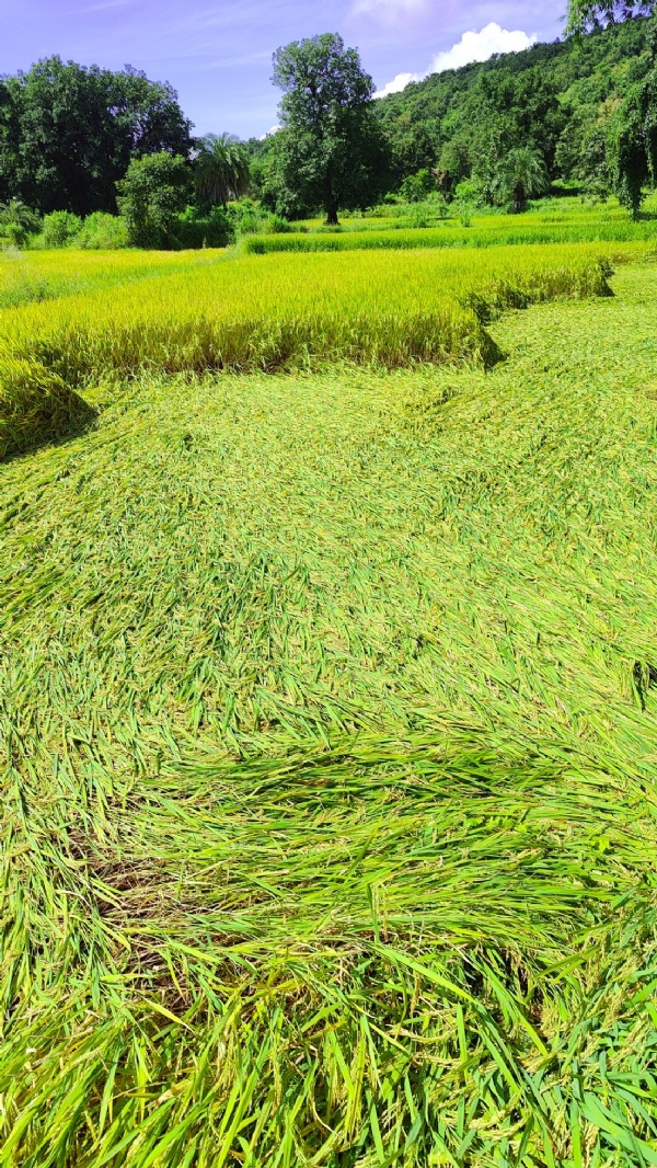 धमतरी, 12 अक्टूबर । आंधी-तूफान व तेज वर्षा से किसानों के तैयार धान फसल जमीन पर चटाई की तरह गिरकर बिछ गई है, इससे किसानों को नुकसान हुआ है। वहीं धान के पौधों पर पानी भरने से फसल के सड़ने की आशंका है। किसानों को अब तेज धूप खिलने के साथ जमीन सूखने व फसल पकने का इंतजार है, ताकि समय पर कटाई कर सके। 10 अक्टूबर को डुबान क्षेत्र के ग्राम चिखली समेत आसपास गांवों में शाम को आंधी-तूफान होने के साथ अच्छी वर्षा हुई है। इससे किसानों के खेतों में पककर तैयार खरीफ धान फसल जमीन पर गिर गई है। धान के बालियों के ऊपर पानी भरने से फसल के सड़ने की आशंका है। इस साल अच्छी वर्षा व खड़ी फसल देखकर किसान अच्छा उत्पादन की संभावना लगाए थे, लेकिन खराब मौसम व वर्षा ने उनके उम्मीदों में पानी फेर दिया।