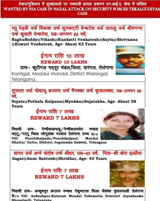 जारी लिस्ट में 14 वांटेड नक्सलियों के नाम है. जिसमें रघु रेड्डी, सुजाता उर्फ़ पोथालु कल्पना सागर उर्फ़ अन्ने संतोष , वेल्ला उर्फ़ वेल्ला मोडियाम, निर्मला उर्फ़ निर्मलक्का, राहुल तेलम उर्फ़ राहुल रय्याम, मदन्ना उर्फ़ जग्गू दादा और अन्य शामिल है.